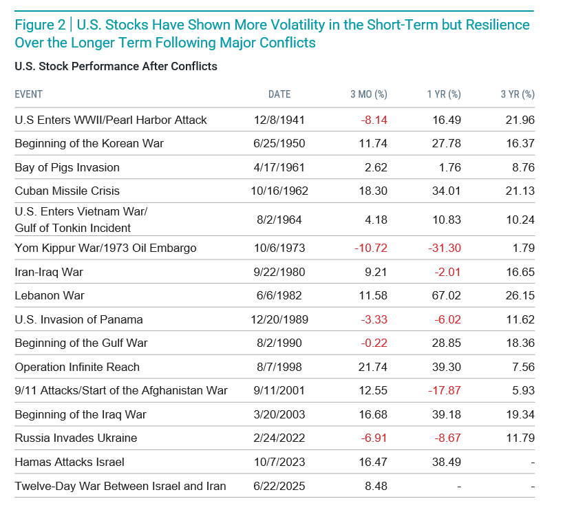 Figure 1 shows the long-term growth of US stocks over time, through wars, military actions, recessions, and other periods of stress. The broader lesson is that markets have a long history of moving through difficult events and rewarding disciplined investors over time.