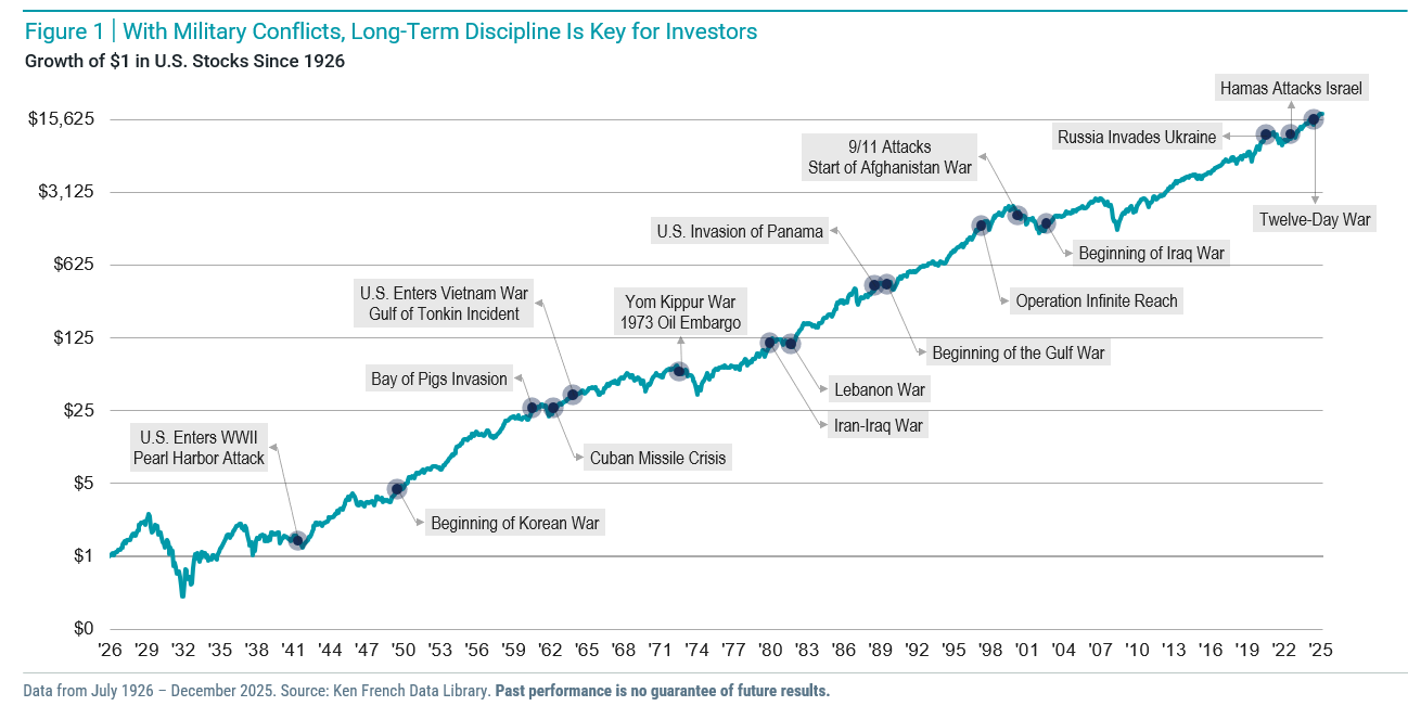 Still, it helps to step back and look at the bigger picture. And, to put things in perspective, consider US stock market performance from 1926 through 2025. During that nearly 100-year period, there were many wars—World War II, the Vietnam War, 9/11, and others.